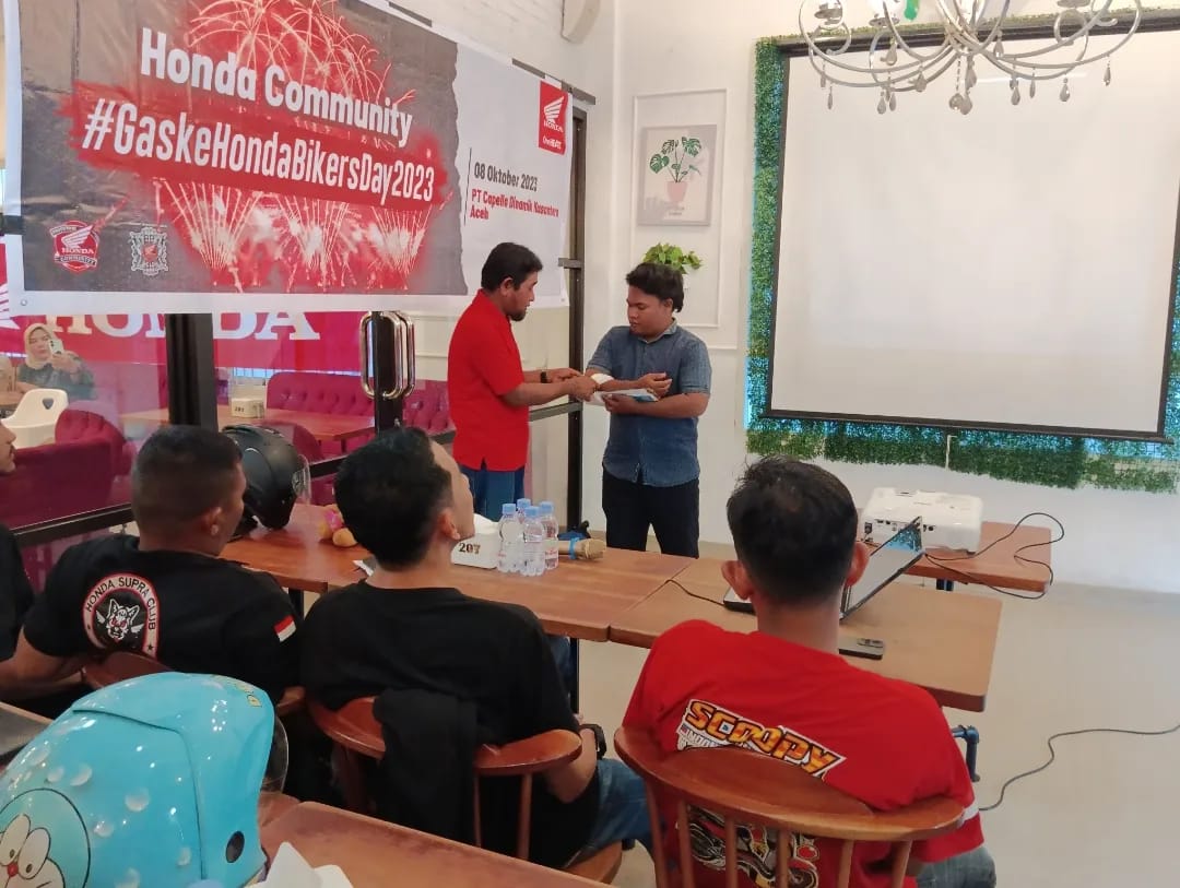 Banda Aceh – Aceh Monitor xom. PT. Capella Dinamik Nusantara (Capella Honda) Aceh selaku Main Dealer Sepeda Motor Honda menggelar kegiatan pembekalan untuk para bikers Honda yang akan melakukan perjalanan touring dari Aceh menuju Malang Jawa Timur untuk menghadiri kegiatan Gathering Akbar Honda Bikers Day Nasional 2023. Pembekalan berupa Pelatihan Basic Life Support ini diselenggarakan di Kanasha Cafe Langsa Minggu, (8/10).