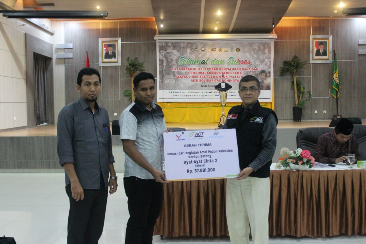 Husaini Ismail selaku Kepala Cabang Aksi Cepat Tanggap Aceh yang menjadi mitra pada kegiatan ini mengatakan, pihaknya sudah menerima donasi sejumlah Rp.37.891.000,- pada tanggal 07 Maret 2018 di Balai Kota Banda Aceh dari hasil pemutaran film Ayat-Ayat Cinta 2 yang diserahkan langsung oleh Panitia. Nantinya, donasi ini akan diteruskan ke saudara-saudara yang ada di Palestina. (rel)