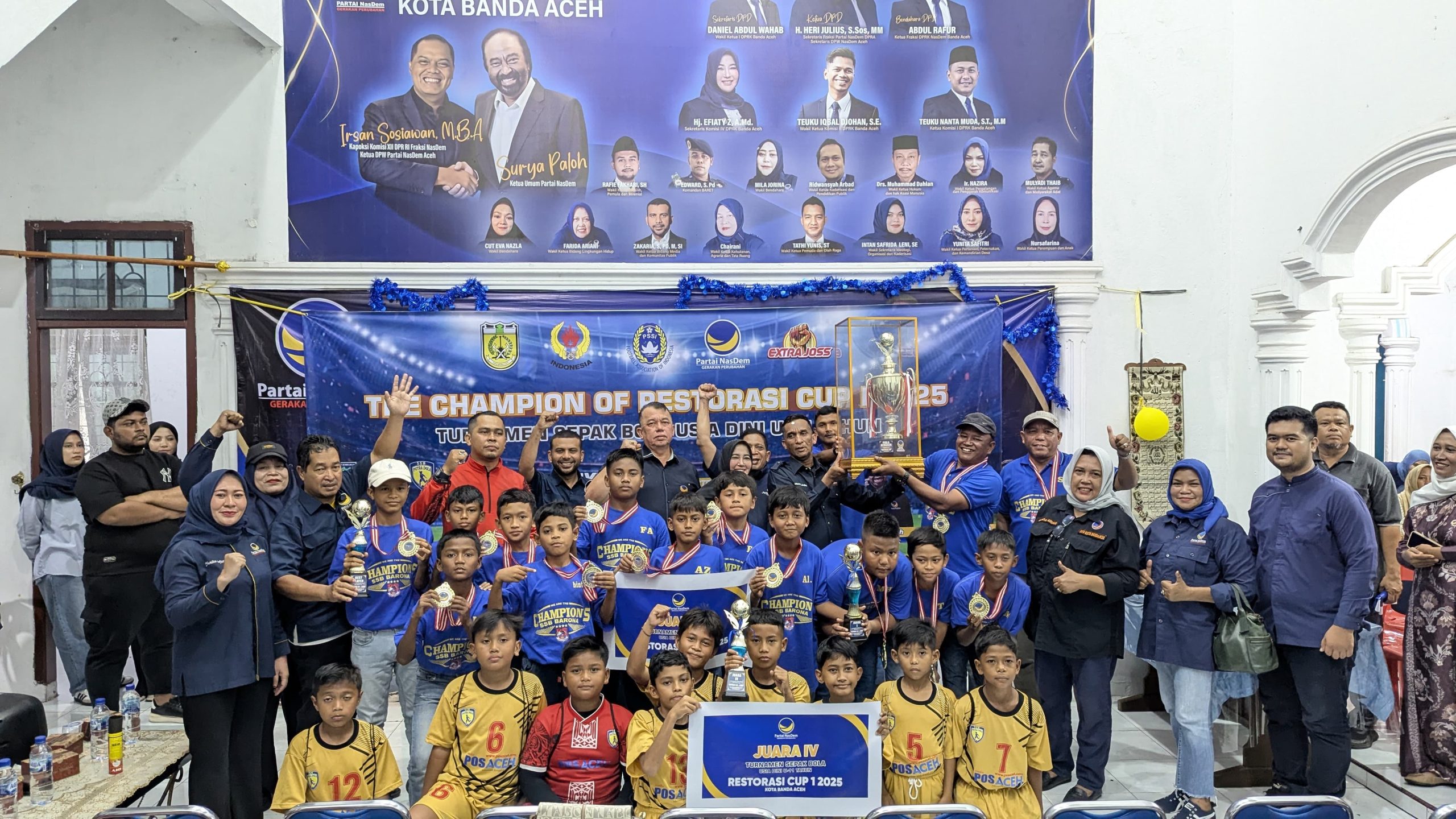Banda Aceh – Aceh Monitor com. Ketua DPD NasDem Banda Aceh yang juga Sekretaris Fraksi NasDem DPR Aceh, H Heri Julius, S.Sos MM menyerahkan Piala Bergilir kepada Juara Festival Sepak Bola Usia Dini Restorasi Cup I tahun 2025, yakni disabet oleh Sekolah Sepak Bola (SSB) Barona, Banda Aceh.