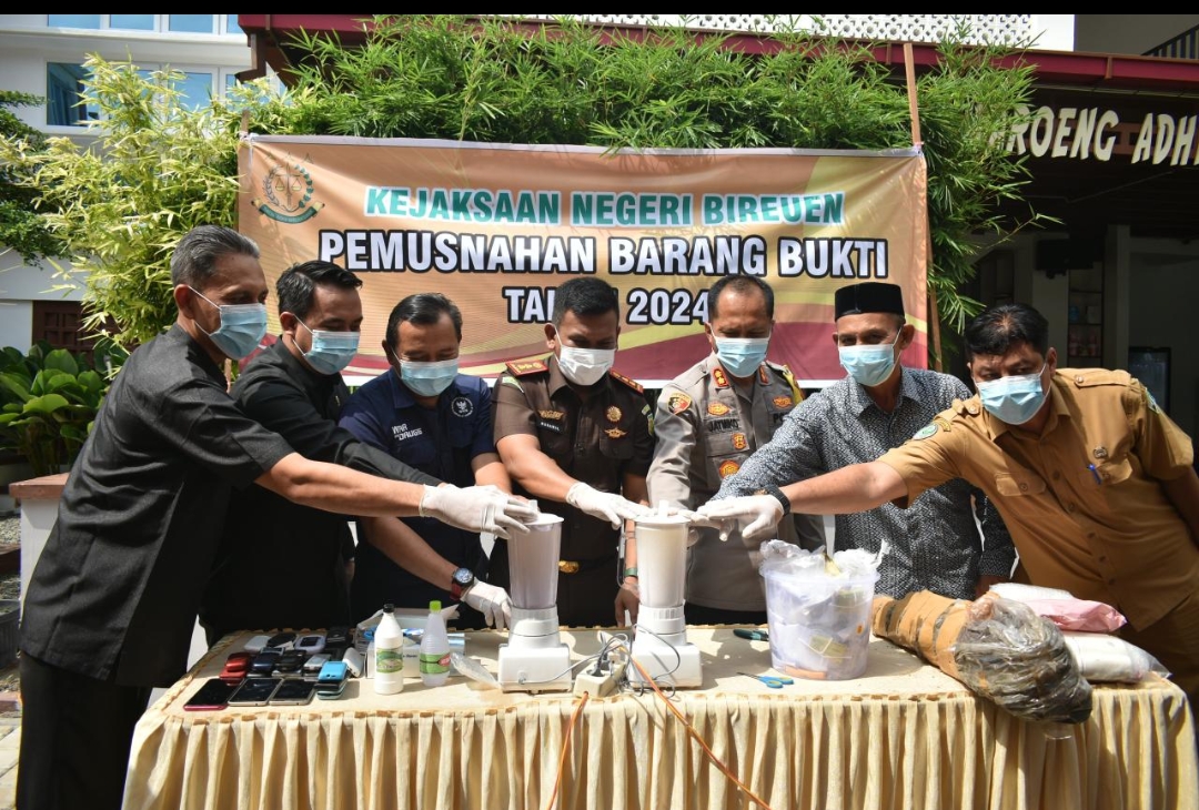 Bireuen – Aceh monitor.com. Kejaksaan Negeri Bireuen melakukan pemusnahan barang bukti/ sitaan perkara Tindak Pidana Umum yang berasal dari perkara Narkotika, perkara Tindak Pidana terhadap Orang dan Harta Benda (OHARDA), Tindak Pidana terhadap Keamanan Negara dan Ketertiban Umum (KAMNEGTIBUM) dan barang bukti/sitaan yang berasal dari Tindak Pidana Umum Lainnya (TPUL).berlangsung di di halaman Kantor Kejaksaan Negeri Bireuen. Selasa 28/5/2024.