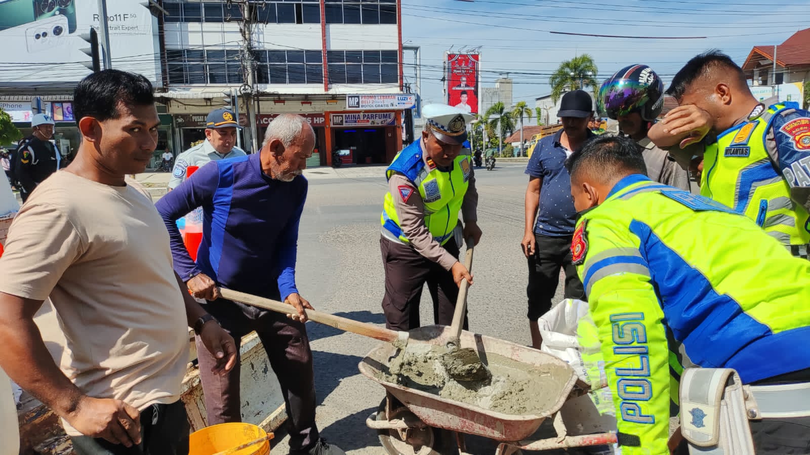 Satuan Polisi lalulintas bersama dengan beberapa instansi diantaranya Dinas Perhubungan, Subdenpom, Jasaharja, melakukan aksi sosial menambal jalan yang bolong di beberapa lokasi dalam kawasan Kabupaten Bireuen.Rabu 3/7/2024.
