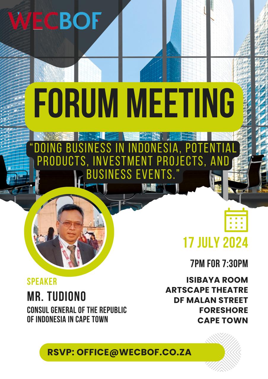 Business forum dibuka oleh CEO WEBCOF, Ariefa Parkar. Dia menyampaikan bahwa WEBCOF merupakan forum untuk mendukung pengusaha terutama UMKM, dengan pemanfaatan jaringan kerja yang dimiliki dan berbagi informasi kesempatan usaha dengan berbagai pihak. Indonesia secara historis telah memiliki kedekatan dengan Afrika Selatan. Business forum diharapkan dapat meningkatkan hubungan bilateral antar Indonesia dan Afrika Selatan serta membuka kesempatan usaha bagi peserta yang hadir.