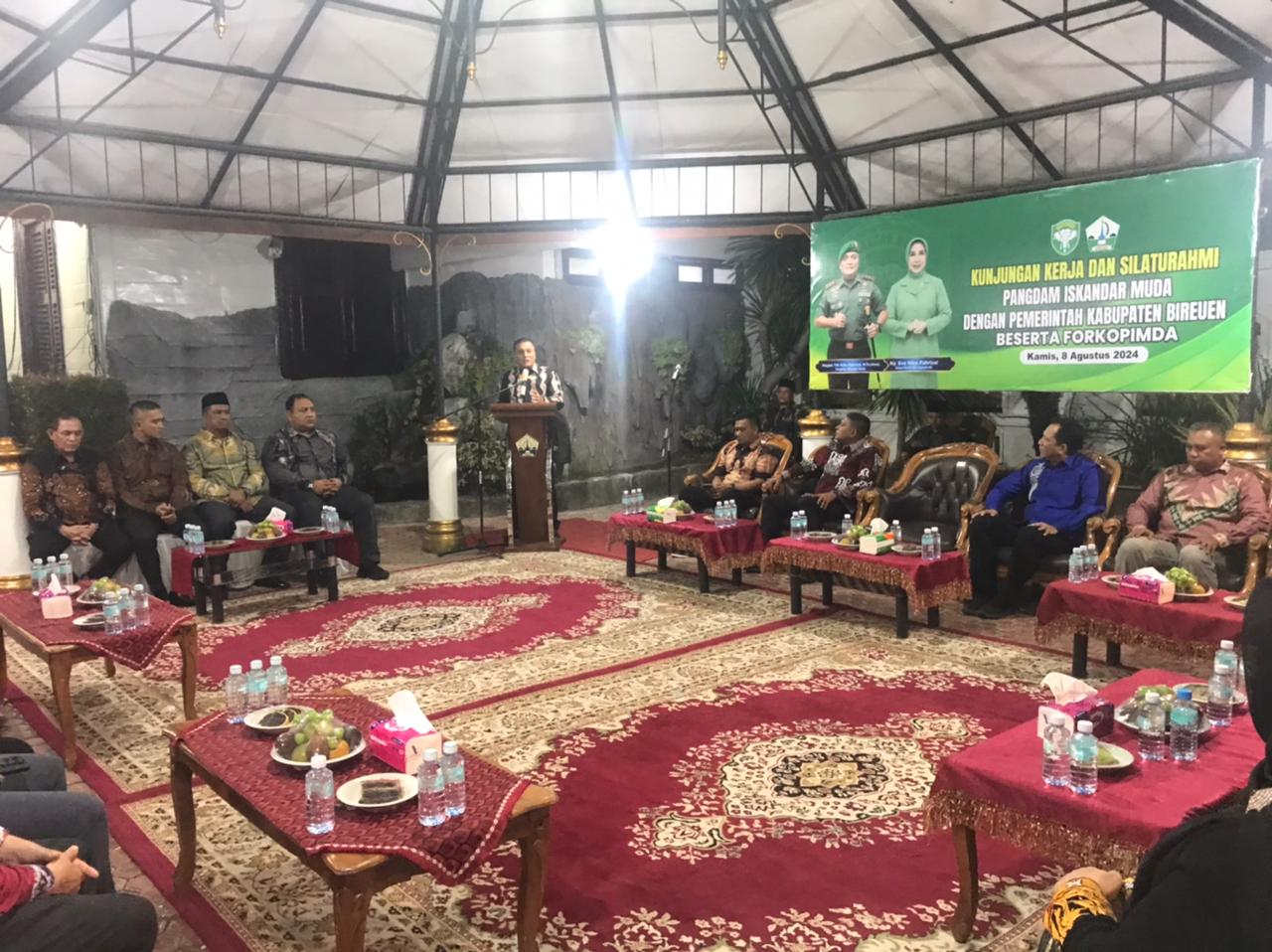 Dalam sambutannya, Pj. Bupati Bireuen Aylia Sofyan mengucapkan selamat datang dan terima kasih atas kunjungan Pangdam IM dan rombongan di Kab. Bireuen, kami merasa terhormat atas kunjungan Pangdam IM ke Kab. Bireuen, kami berharap dengan adanya kunjungan Pangdam IM dapat menjadi motivasi bagi kami serta bisa memberikan nasehat kepada kami agar lebih baik untuk kedepannya”.ucapnya.