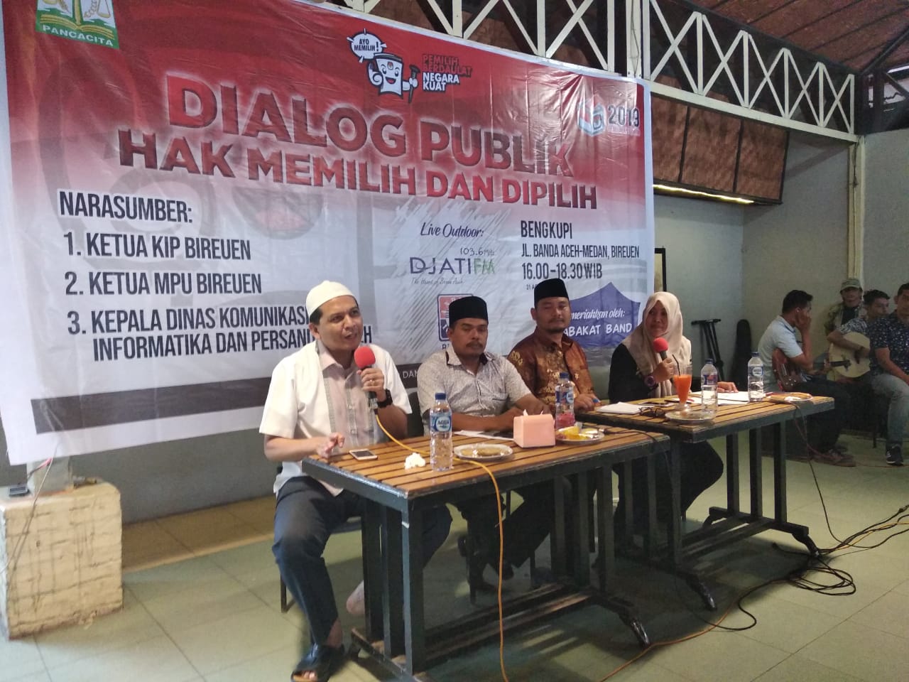 BIREUEN – Aceh Monitor Com. Dinas Komunikasi Informatika dan Persandian Aceh, menggelar dialog publik bertemakan hak memilih dan dipilih. Dialog interaktif tersebut turut dihadiri Kepala Dinas Kominfo dan Sandi Aceh, Marwan Nusuf, Ketua Komisi Independen Pemilihan (KIP) Bireuen yang diwakil Komisioner KIP Muhammad Basyir, dan Kepala Kesbangpol dan Linmas Bireuen Zaldi dan peserta dari berbagia element masyarakat berlangsung di Cafe Bengkupi Geulanggang Teungoh Bireuen, Jumat (31/08/18).