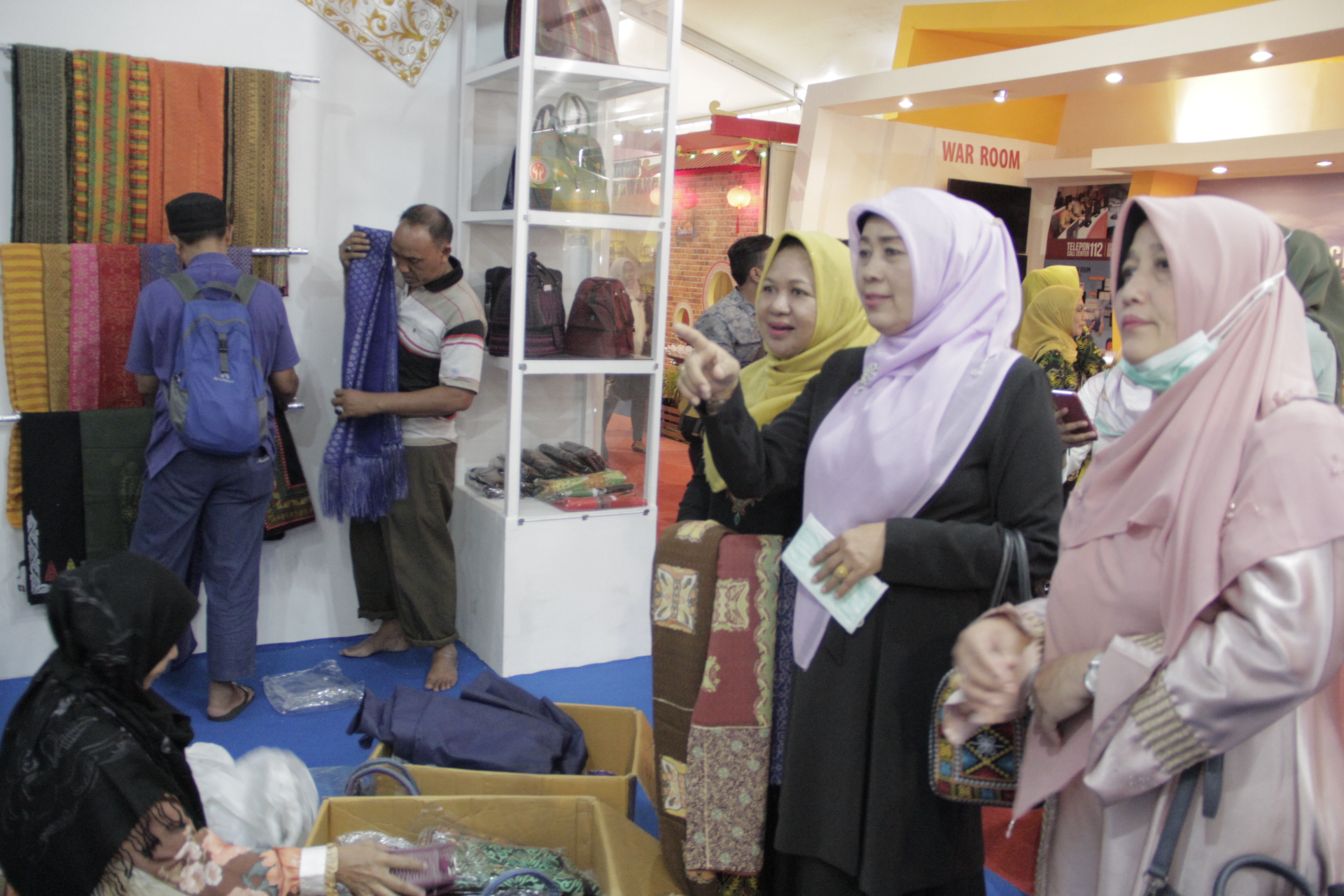 “Banyak yang kita tampilkan, produk unggulannya ada dompet pucok reubong sama songket,” ujar Nurmiaty.