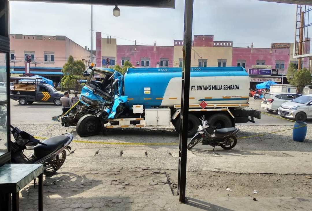 Diduga rem Truk Tangki BK 8033 WO tidak berfungsi dengan baik, sehingga menabrak dinding samping kanan belakang Truk Tronton BL 8886 PZ.